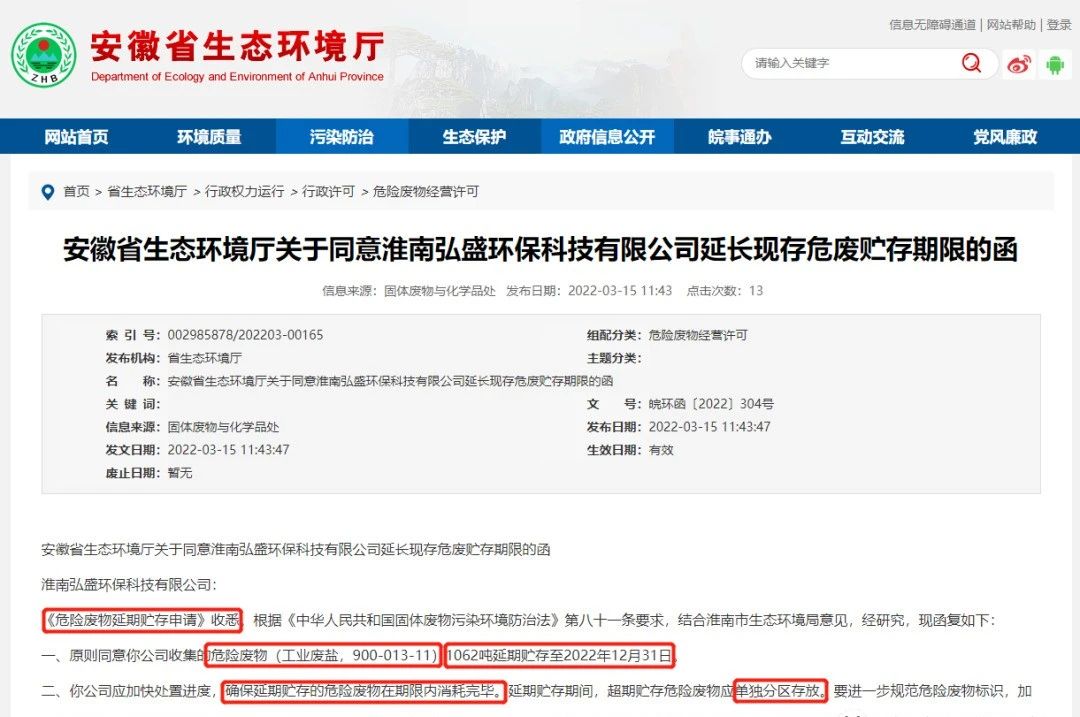 安徽省生態(tài)環(huán)境廳關(guān)于同意淮南弘盛環(huán)保科技有限公司延長(zhǎng)現(xiàn)存危廢貯存期限的函 《危險(xiǎn)廢物延期貯存申請(qǐng)》收悉。根據(jù)《中華人民共和國(guó)固體廢物污染環(huán)境防治法》第八十一條要求,結(jié)合淮南市生態(tài)環(huán)境局意見,經(jīng)研究,現(xiàn)函復(fù)如下: