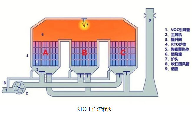 RTO主要包括固定床式RTO和旋轉(zhuǎn)式RTO,其中固定床式RTO又可分為兩室和多室等類型。以三室RTO為例,其工作原理為將待處理的低溫有機(jī)廢氣在引風(fēng)機(jī)作用下進(jìn)入蓄熱室A,陶瓷蓄熱體釋放熱量溫度降低,而有機(jī)廢氣升至較高的溫度之后進(jìn)入燃燒室。在燃燒室中燃燒器燃燒補(bǔ)充熱量,使廢氣升至設(shè)定的氧化溫度(一般為760℃),廢氣中的有機(jī)物被分解成CO2和H2O。