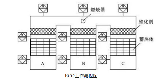 有機(jī)廢氣從A室進(jìn)入,在催化氧化爐內(nèi)被加熱到250~300℃后有機(jī)廢氣在貴金屬催化劑的作用下發(fā)生無焰燃燒,廢氣中的有機(jī)物被分解成CO2和H2O,通過B室釋放熱量,溫度降低后排放,而蓄熱室B的陶瓷吸熱,“貯存”大量的熱量(用于下個(gè)循環(huán)加熱使用),同時(shí)C室執(zhí)行反吹動(dòng)作;在切換新周期后,廢氣從B室進(jìn)入,經(jīng)催化氧化處理通過C室釋放熱量后排出,同時(shí)A室執(zhí)行反吹動(dòng)作;再下個(gè)周期則是廢氣從C室進(jìn)入,經(jīng)催化氧化處理后通過A室釋放熱量后排出,同時(shí)B室執(zhí)行反吹動(dòng)作;如此循環(huán)往復(fù)。