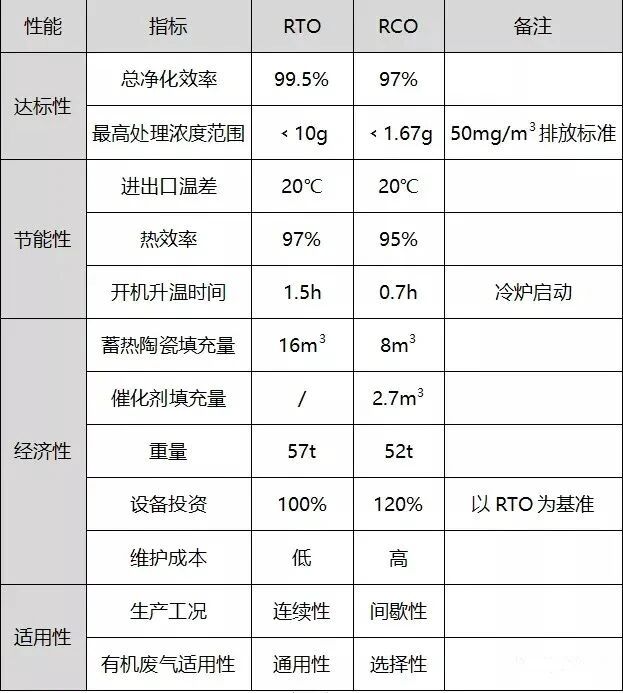 不同類型的RTO/RCO性能差異較大,同樣以三室為例,處理風(fēng)量30000m3/h時(shí),兩種處理設(shè)備主要性能及關(guān)鍵運(yùn)行參數(shù)對(duì)比如下表所示: